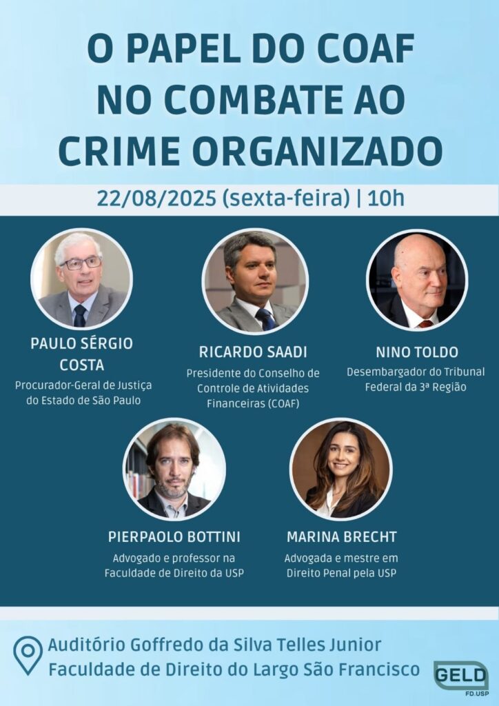 Os desafios do Conselho de Controle de Atividades Financeiras (COAF) para produzir relatórios que ofereçam elementos no combate aos crimes de lavagem de dinheiro, de financiamento ao crime organizado entre outras aflições que envolvem as operações financeiras suspeitas, serão discutidos no seminário “O papel do COAF no combate ao crime organizado”, que acontece nesta sexta-feira (22/08), às 10h, no Auditório Goffredo da Silva Telles Jr. da Faculdade de Direito da USP.